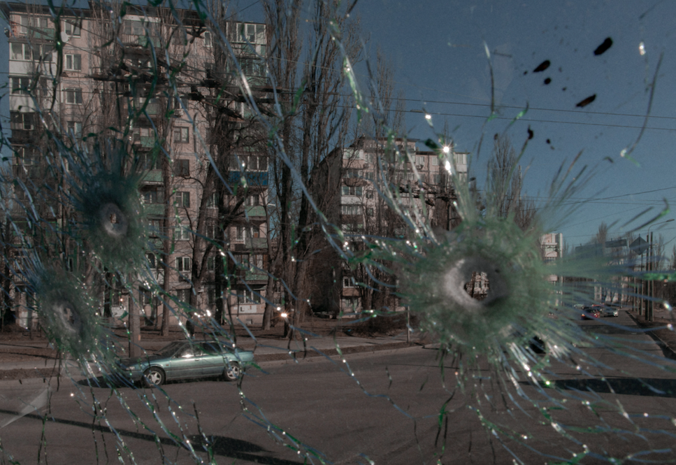 Cars are seen through the damaged window of a vehicle hit by bullets, as Russia's invasion of Ukraine continues, in Kyiv, Ukraine, February 28, 2022. Photo: Jedrzej Nowicki/Agencja Wyborcza.pl via Reuters