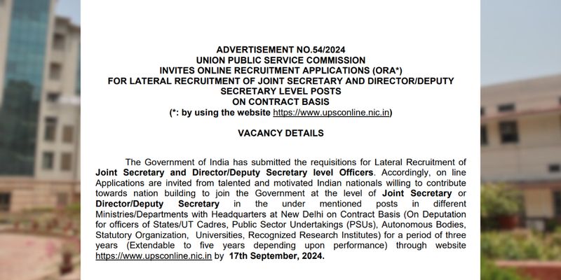“The Government of India has submitted the requisitions for Lateral Recruitment of Joint Secretary and Director/Deputy Secretary level Officers. Accordingly, on line Applications are invited from talented and motivated Indian nationals willing to contribute towards nation building to join the Government at the level of Joint Secretary or Director/Deputy Secretary in the under mentioned posts in different Ministries/Departments with Headquarters at New Delhi on Contract Basis (On Deputation for officers of States/UT Cadres, Public Sector Undertakings (PSUs), Autonomous Bodies, Statutory Organization, Universities, Recognized Research Institutes) for a period of three years (Extendable to five years depending upon performance) through website https://www.upsconline.nic.in by 17th September, 2024,” the advertisement reads.