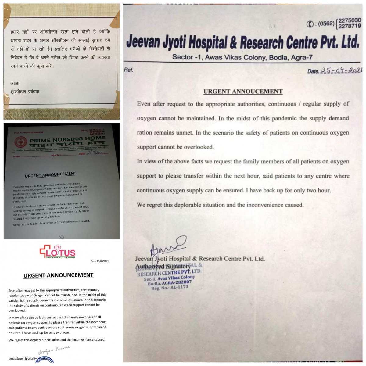 The situation had turned so grave that hospitals started posting notices of oxygen running out, asking relatives to transfer their patients to other hospitals. On April 26, Nayati Healthcare put out an SOS tweet stating that the lives of 144 COVID-19 patients were at stake at Nayati Medicity in Mathura.