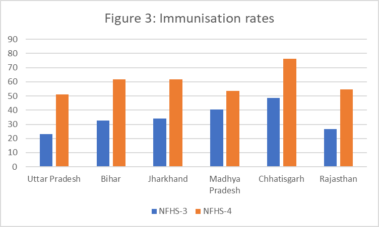 The human development outcomes of the inclusive social coalitions that governed UP between 2007 and 2017 are clearly discernible. Several of these outcomes pertain directly to the effectiveness of the state in delivering services. In this section, I draw on a comparison of data from the National Family Health Surveys (NFHS) 3 and 4.