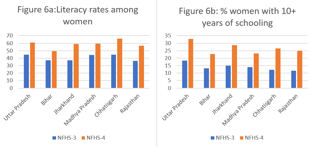 Women’s literacy rates increased to 61%, the highest among the BIMARU states except Chhattisgarh. The proportion of women with at least ten years of education also increased, placing UP ahead of the other BIMARU States.