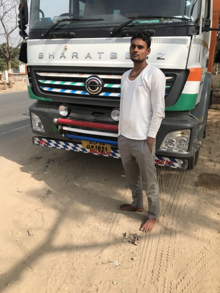 Parked up the road was a gigantic, shiny, 14-wheeled Bharat Benz lorry. The young driver was taking a nap in the air-conditioned cab of his vehicle. I knocked gently and he readily climbed down for a chat with me. He was Gauri Shanker Yadav (22), who drives long distances from Gandhidham in Gujarat to Kolkata in West Bengal, traversing Rajasthan, Haryana, Uttar Pradesh, Bihar and Jharkhand.