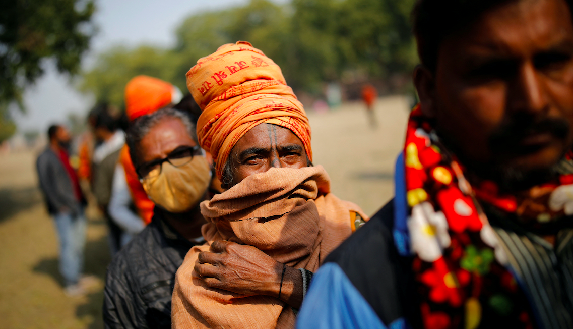 A sadhu stands in a queue to cast his vote at a polling station in Vrindavan of Uttar Pradesh, India, February 10, 2022. Photo: Reuters/Adnan Abidi