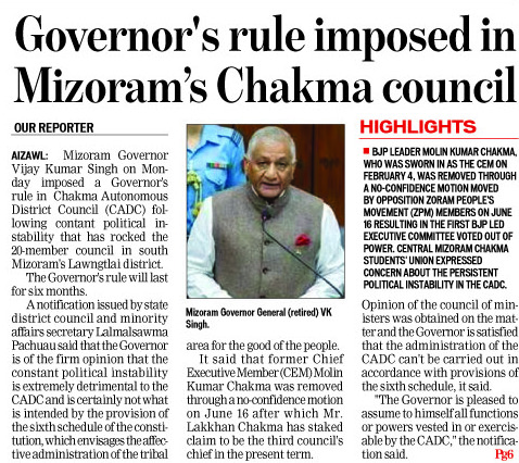 Lakkan Chakma who had moved to ZPM from the BJP, then staked claim to form the new council. However, barely three weeks after that motion was successfully passed against the BJP, governor Singh decided to turn it down and instead extend his direct rule to the Council for the next six months, subject to its extension by the state assembly.