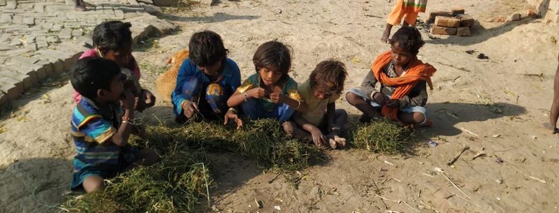 On Wednesday, a group of children were seen sitting cross-legged and eating grass, called “akri” in the local language. The six kids, about five years old, from the Musahar community, live in the Musahar Basti in Koiripur village in the Badagaon block of Varanasi district. They have been identified as Rani, Pooja, Vishal, Neerhu, Soni and Golu. Out of desperation and hunger, the children were eating the grass usually given to cattle as fodder from a wheat field in the village.