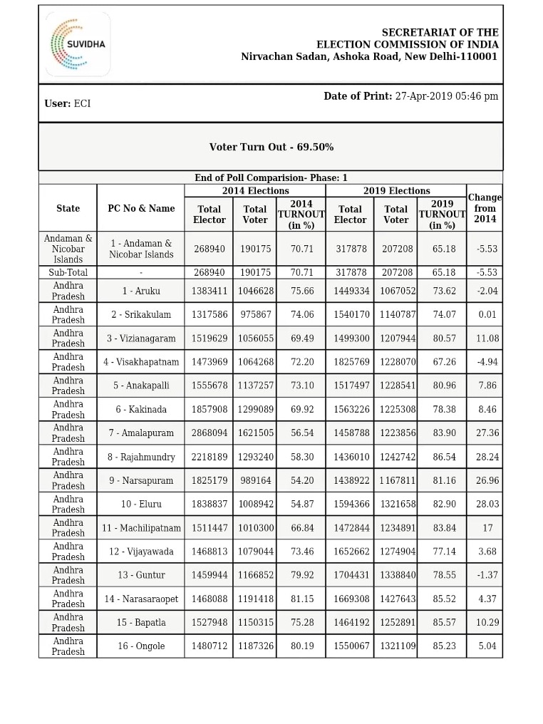 The voter turnout data of the 2019 Lok Sabha elections not just carried the votes polled data in numbers and percentage, but also had a comparison with the voter turnout data of the 2014 Lok Sabha elections. As you can see in the document below, it shows the data of printing of the data, and comparison between the 2014 LS elections voter turnout with 2019 LS elections.