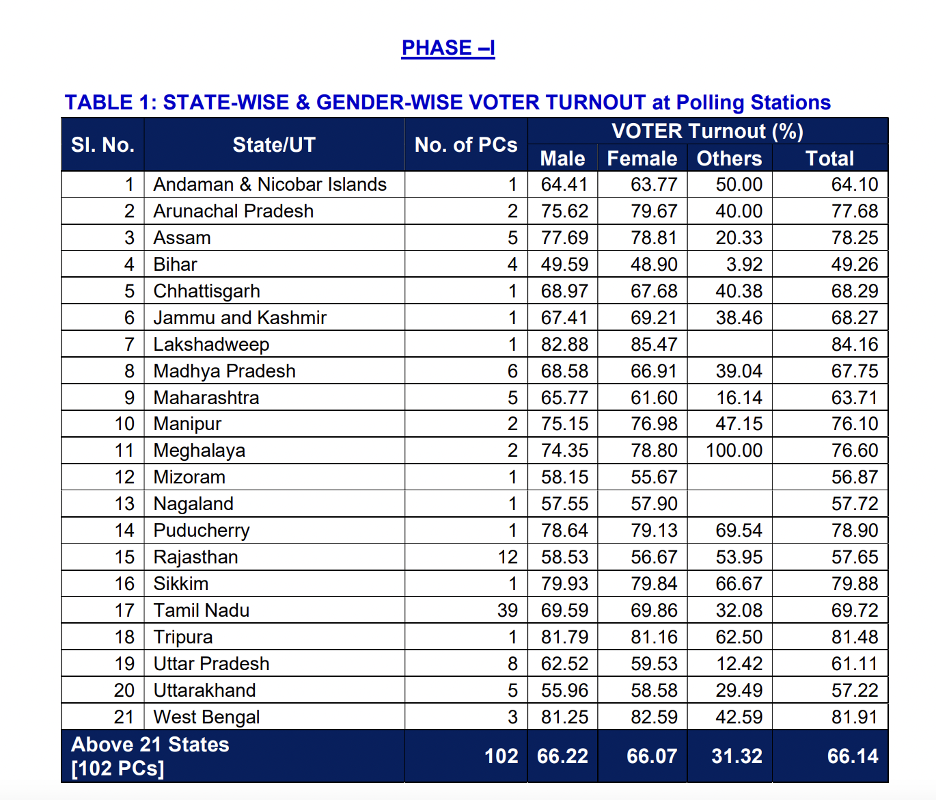 Now look at the 2024 LS elections voter turnout data below. It gives parliamentary constituency-wise data of male, female, others and total voter turnout data in percentage. Clearly, the 2019 LS elections data was far more detailed.