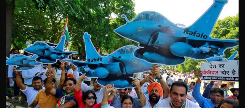 File photo of members of the Congress party during a protest calling for a probe into the Rafale fighter planes deal with France. Credit: Ajay Verma/Reuters
