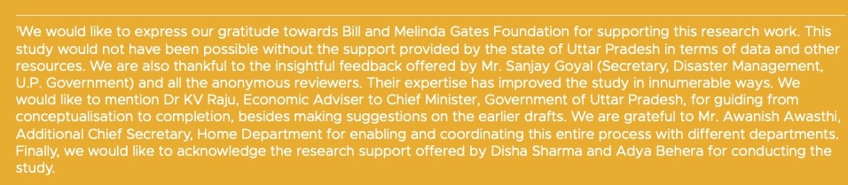 A footnote on the first page acknowledges all those who helped the authors in the process of the ‘study’. Apart from financial support from the Gates Foundation, the authors openly acknowledge the central role the Uttar Pradesh government itself played in guiding the study “from conceptualisation to completion”. “Insightful feedback” was offered by Mr. Sanjay Goyal (Secretary, Disaster Management, U.P. Government).