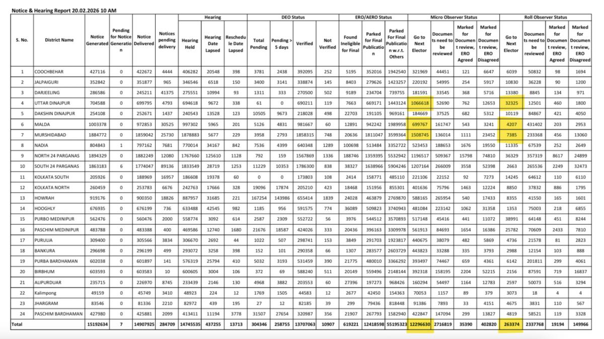 Interestingly, an internal report prepared by the ECI on February 20 reveals that a massive number of electors across West Bengal had initially cleared observer-level verification checks. This included 1,22,96,630 voters marked as “Go to Next Elector” by the ECI-appointed micro observers, meaning they are cleared, and 2,63,374 by roll observers, while the District Election Officer (DEO) status was verified for 1,37,07,063 voters.