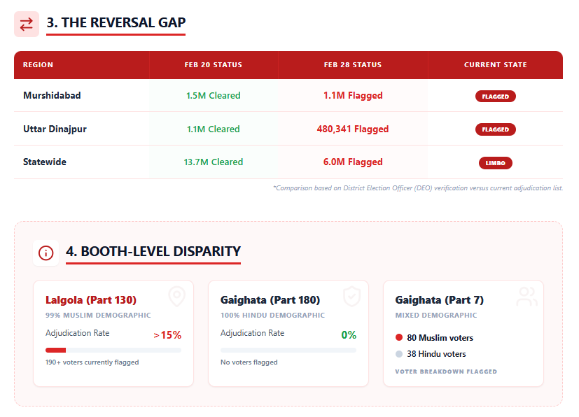 A deeper look by The Wire across three polling stations further revealed a skewed application of the "under adjudication" status. In Part No. 186 (80% Muslim), 31 voters were flagged, with only one being Hindu.
