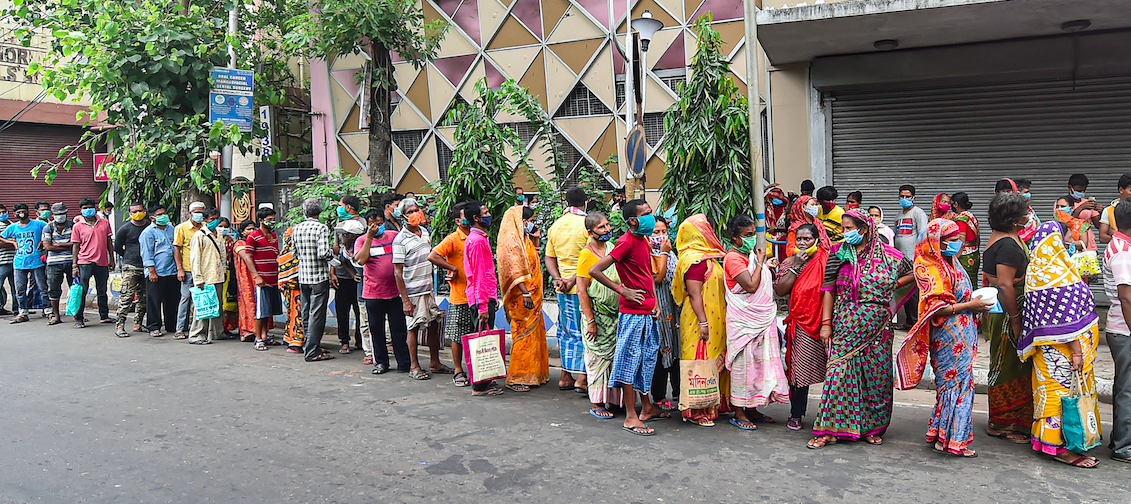 People stand in a queue to collect food distributed by volunteers outside a city hospital, during COVID-induced lockdown in Kolkata, Thursday, June 10, 2021. Photo: PTI