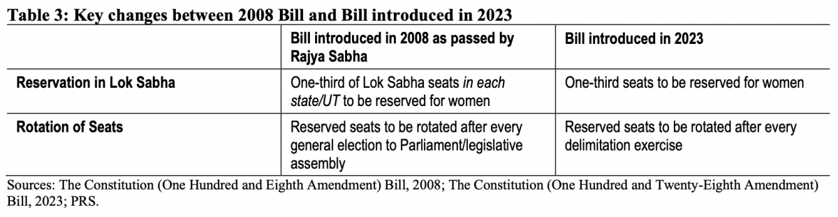 The Constitution (One Hundred and Twenty-Eighth Amendment) Bill, 2023 was introduced in Lok Sabha on September 19, 2023. The Bill seeks to reserve one-third of the total number of seats in Lok Sabha and state legislative assemblies for women.