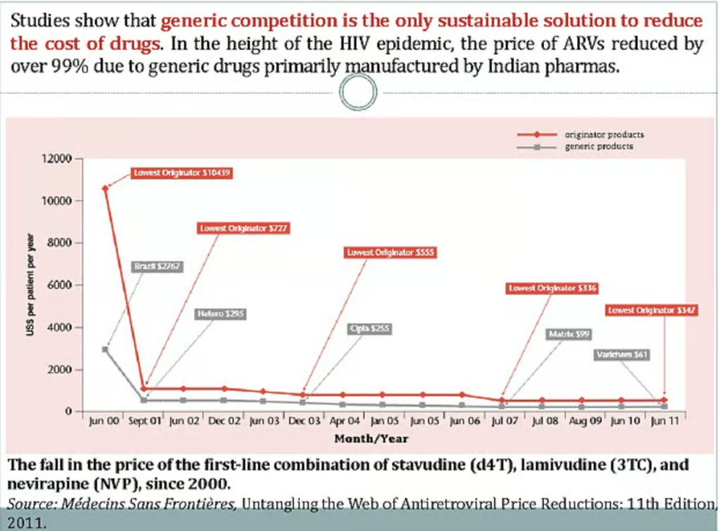 Because of the absence of patent protection in India, Indian generic companies were able to market the generic ARVs at affordable prices. Indian generic industry was able to supply high quality ARVs to initially, the developed world, including South Africa and later, even to the developing world. The United States Agency for International Development, the United States President's Emergency Plan for AIDS Relief, the World Health Organisation and USAID, PEPFAR, WHO and Unitaid supplied generic ARVs to the People Living with HIV ('PLHIV') all over the world. Most of the PLHIVs could be delivered the triple combination therapy and millions of lives were saved. Today we have an international target of getting rid of HIV/AIDS by 2030, which is now delayed first because of COVID and later due to cut back in funding. In another decade, HIV could be eradicated. HIV is the only pandemic which was fought on the basis of rationality, science, rights based strategies involving affected communities in the decision making processes and strategies in the battle against HIV have proven to be a success story!