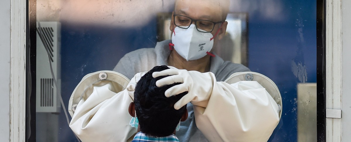 A medic collects a swab sample of a man from a new swab testing cabin at Podar hospital in Worli during a nationwide lockdown in the wake of coronavirus pandemic, in Mumbai, Sunday, April 19, 2020. Photo: PTI/Kunal Patil