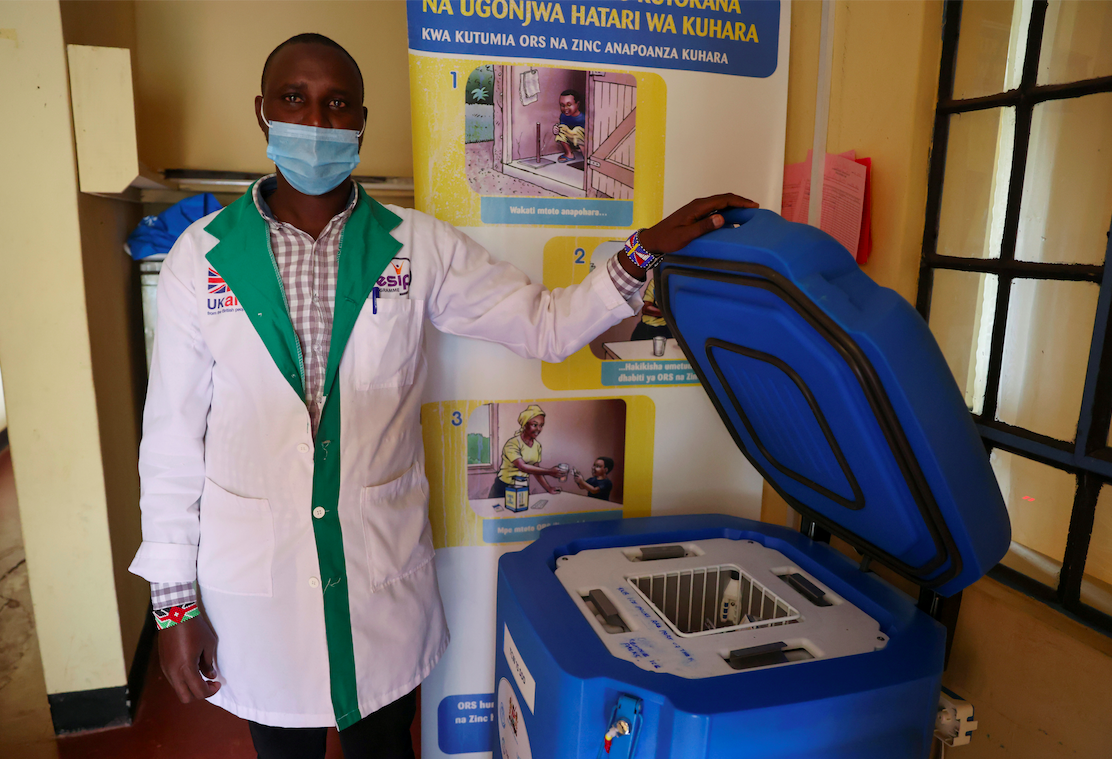 A clinical officer Gerald Yiaile stands next to an empty vaccine refrigerator at a health clinic in the town of Sekenani, Narok county, Kenya, December 1, 2021. Picture taken December 1, 2021. REUTERS/Baz Ratner