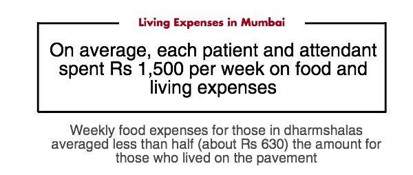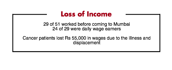 The patients also lost Rs 55,000, on average, in wages due to cancer. Even though they were living on the footpath, they spent Rs 1,500 every week on food and other expenses.