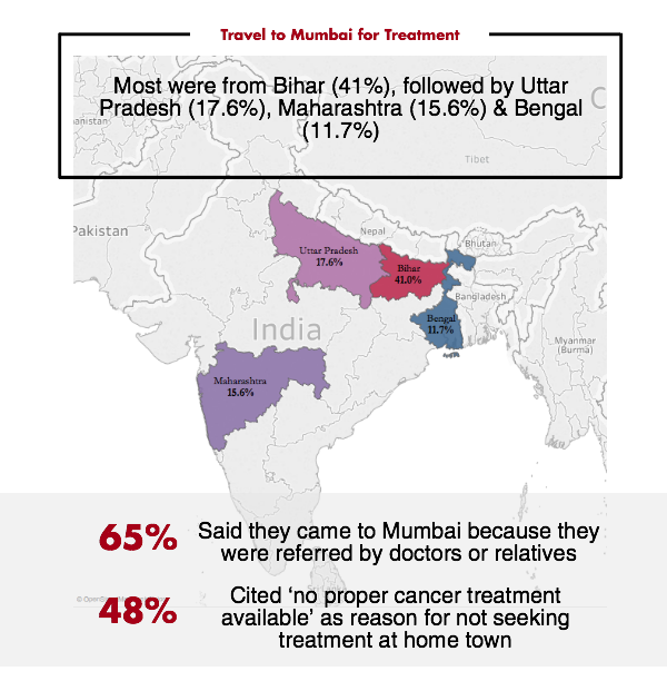 Nearly half (48%) cited “no proper cancer treatment available” as the reason for not seeking treatment in their home towns, and 65% said they came to Mumbai because they were advised to make the journey by doctor or relatives. Of the 51 patients we spoke to, 92% had sought medical care before coming to Tata Memorial Hospital: 60% from a private facility and 50% from a government hospital (many chose both).