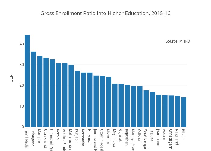 Redistributive effects of electoral competitiveness have combined with progressive thinking – namely, greater social sector expenditure per capita – to enable Karnataka to make big leaps. One area where progressive thinking is visible is the investment in tertiary education (in addition to primary education). After Andhra Pradesh and Puducherry, Karnataka has the third highest number of colleges amongst all states and Union territories per lakh of its population. At 50 colleges per one lakh people, it is nearly the twice of Gujarat (28). In the past five years (2010-2015), Karnataka’s colleges per lakh have grown at 13.3% in comparison with Gujarat at 5.75%. Gujarat keeps company with its BJP-ruled counterparts – Chhattisgarh (20), Madhya Pradesh (23) and Rajasthan (29).