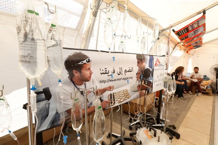 A member of the International Committee of the Red Cross demonstrates on a medical training manikin during a conflict medicine conference at the American University of Beirut Medical Center (AUBMC) in Beirut, Lebanon May 11, 2017. Picture taken May 11, 2017. Credit: Reuters/Mohamed Azakir