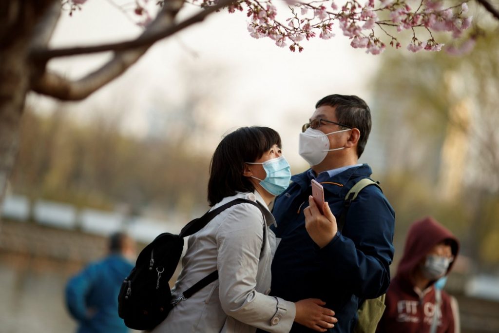 People wear protective masks while they mingle at a park, as the country is hit by an outbreak of COVID-19 in Beijing, China, March 23, 2020. Photo: Reuters/Thomas Peter