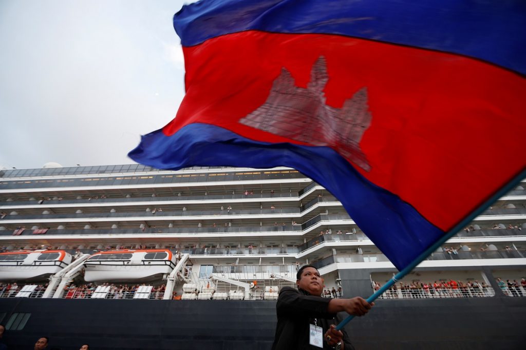 A man waves a Cambodian flag next to MS Westerdam, cruise ship that spent two weeks at sea after being turned away by five countries over fears that someone aboard might have the coronavirus, as it docks in Sihanoukville, Cambodia February 14, 2020. Photo: REUTERS/Soe Zeya Tun