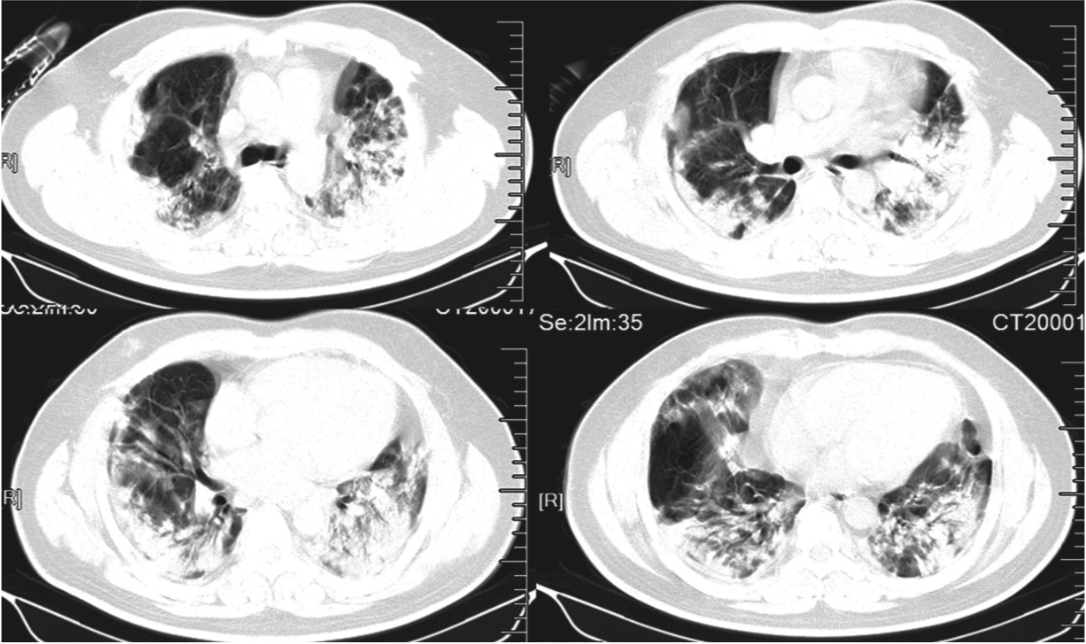 Transverse chest CT images from a 40-year-old man showing bilateral multiple lobular and subsegmental areas of consolidation on day 15 after symptom onset. Photo: January 24, 2020; https://doi.org/10.1016/ S0140-6736(20)30183-5; LANCET