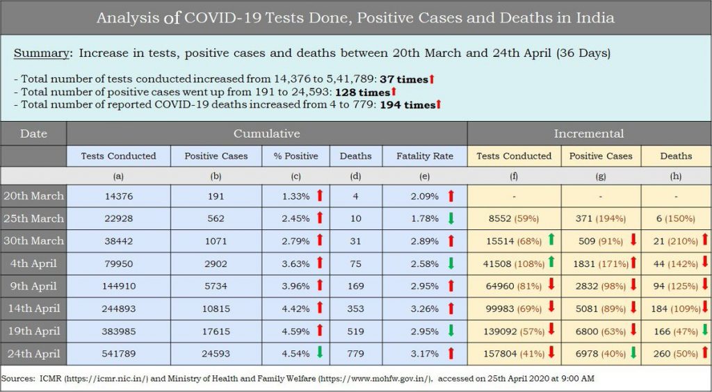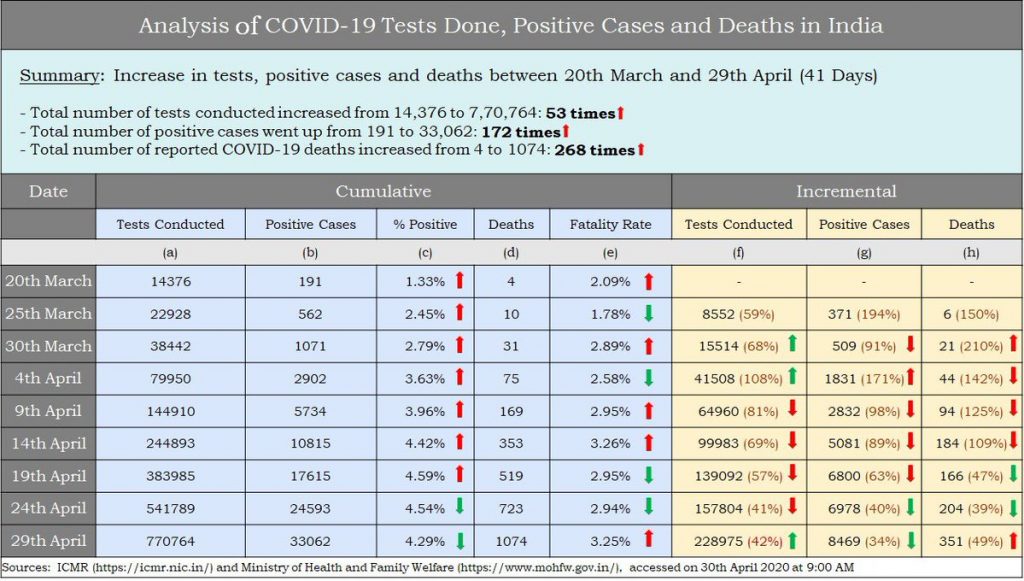 In another tweet, Kishor calculated that "the total number of tests” conducted between March 20 and April 29 had cumulatively increased by 53-times (despite the successive week-on-week drop in growth rates in between) while the number of positives jumped 172-times and the number of deaths, 268-times.