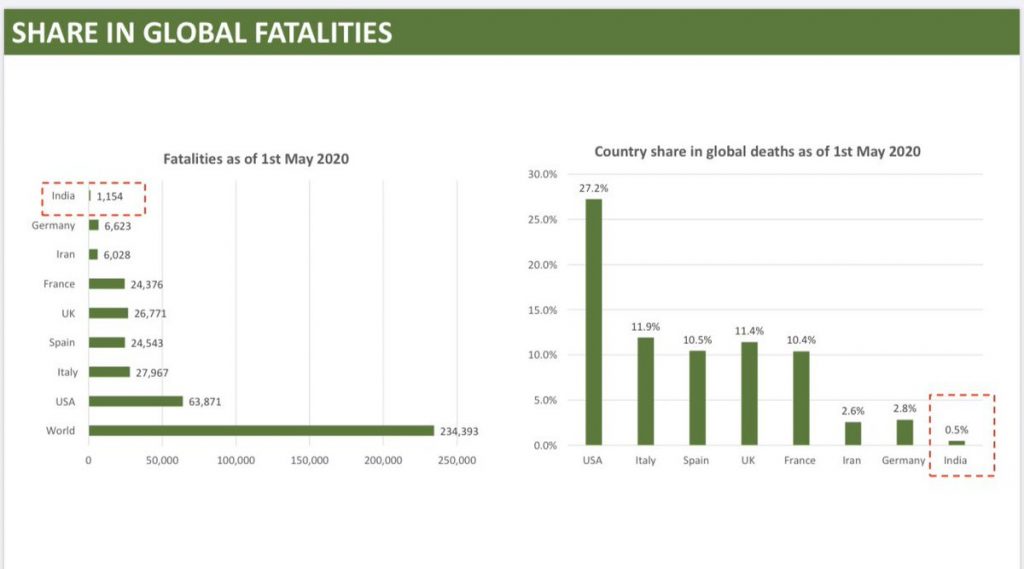 For some reason, Kant doesn’t mention the fatality rate, only the global share of fatalities. But on May 1, data from John Hopkins University placed India's fatality rate – the number of deaths either per 100 confirmed cases – at 3.3%. This is much lower than every Western country, including Germany, which stands at 4.1%. But is higher when compared to our South Asian neighbours, Pakistan (2.3%) and Bangladesh (2.1%).
