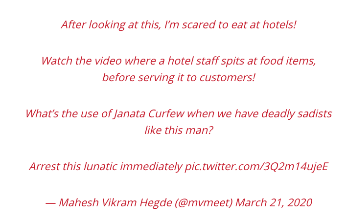 A 45-second video of an employee at a restaurant packing food has been shared with the claim that a Muslim man is spitting on the food before delivering it to customers. On March 21, Mahesh Vikram Hegde, founder of fake news platform Postcard News tweeted the viral video and wrote, “What’s the use of Janata Curfew when we have deadly sadists like this man? Arrest this lunatic immediately.”