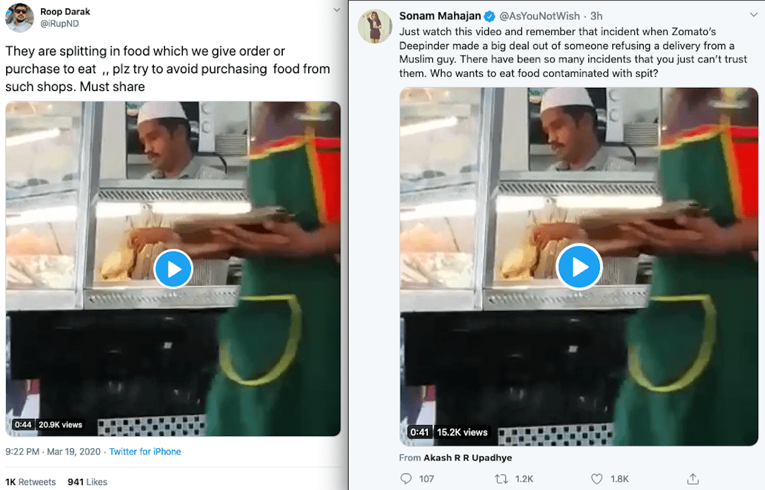 Roop Darak, Telangana State spokesperson at BJP’s youth wing Bharatiya Janta Yuva Morcha, tweeted the viral video and called for a boycott of “such shops”. This was retweeted over 1,000 times (archive link). BJP supporter Sonam Mahajan also tweeted the viral video and justified an incident where a man had refused delivery from a Zomato executive who was a Muslim man. Her tweet was retweeted over 1,200 times. (archive link)