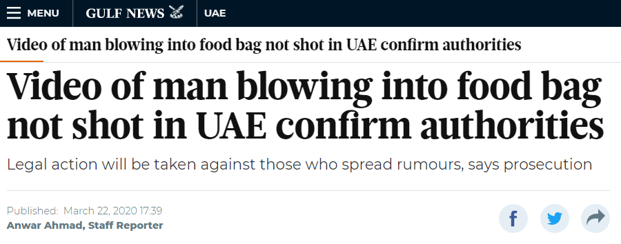 A March 22, 2020, report in Gulf News said, “Abu Dhabi Public Prosecution has confirmed that a viral online video of a worker blowing into a plastic bag containing food was not shot in the UAE.” The report also stated that the video of a man blowing into a food bag was traced to an “Asian country”.