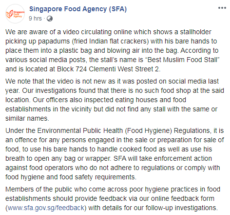 SFA debunked social media claims that the stall’s name is “Best Muslim Food Stall” located at Block 724 Clementi West Street 2. The agency stated, “Our investigations found that there is no such food shop at the said location. Our officers also inspected eating houses and food establishments in the vicinity but did not find any stall with the same or similar names.”