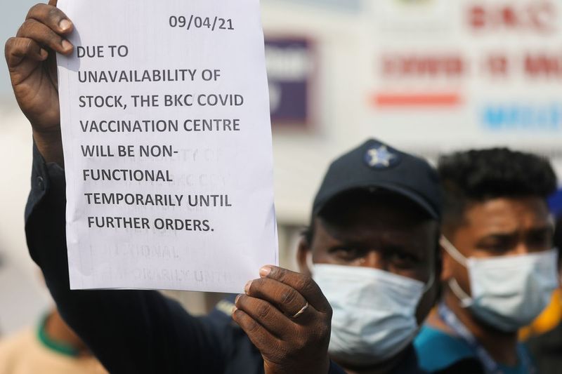 Notices about the shortage of COVISHIELD, a coronavirus disease (COVID-19) vaccine manufactured by Serum Institute of India, are seen outside a COVID-19 vaccination centre in Mumbai, India, April 20, 2021. Photo: Reuters/Francis Mascarenhas