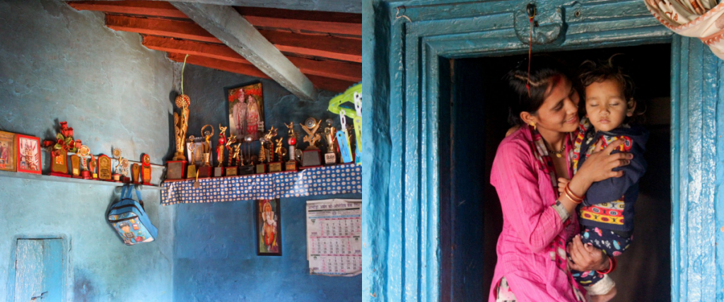 Left: Manisha proudly discusses her husband Dheeraj’s cricket accomplishments. Right: Her two-year-old son Rohan was born in a private hospital. Photo: Jigyasa Mishra/People's Archive of Rural India