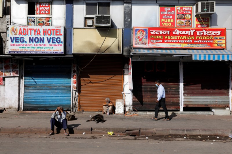 Men sit outside closed restaurants during the COVID-19 lockdown in New Delhi, March 25, 2020. Photo: Reuters/Adnan Abidi