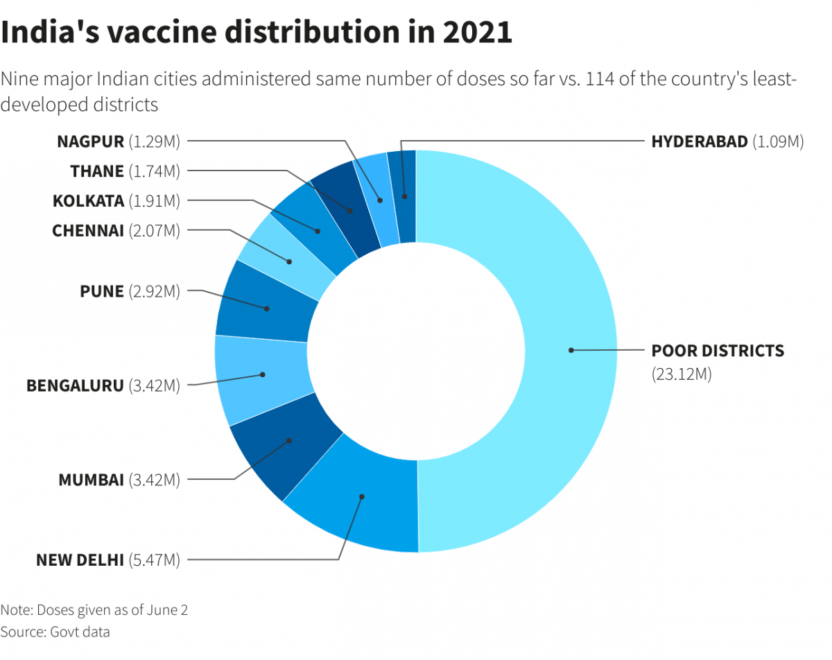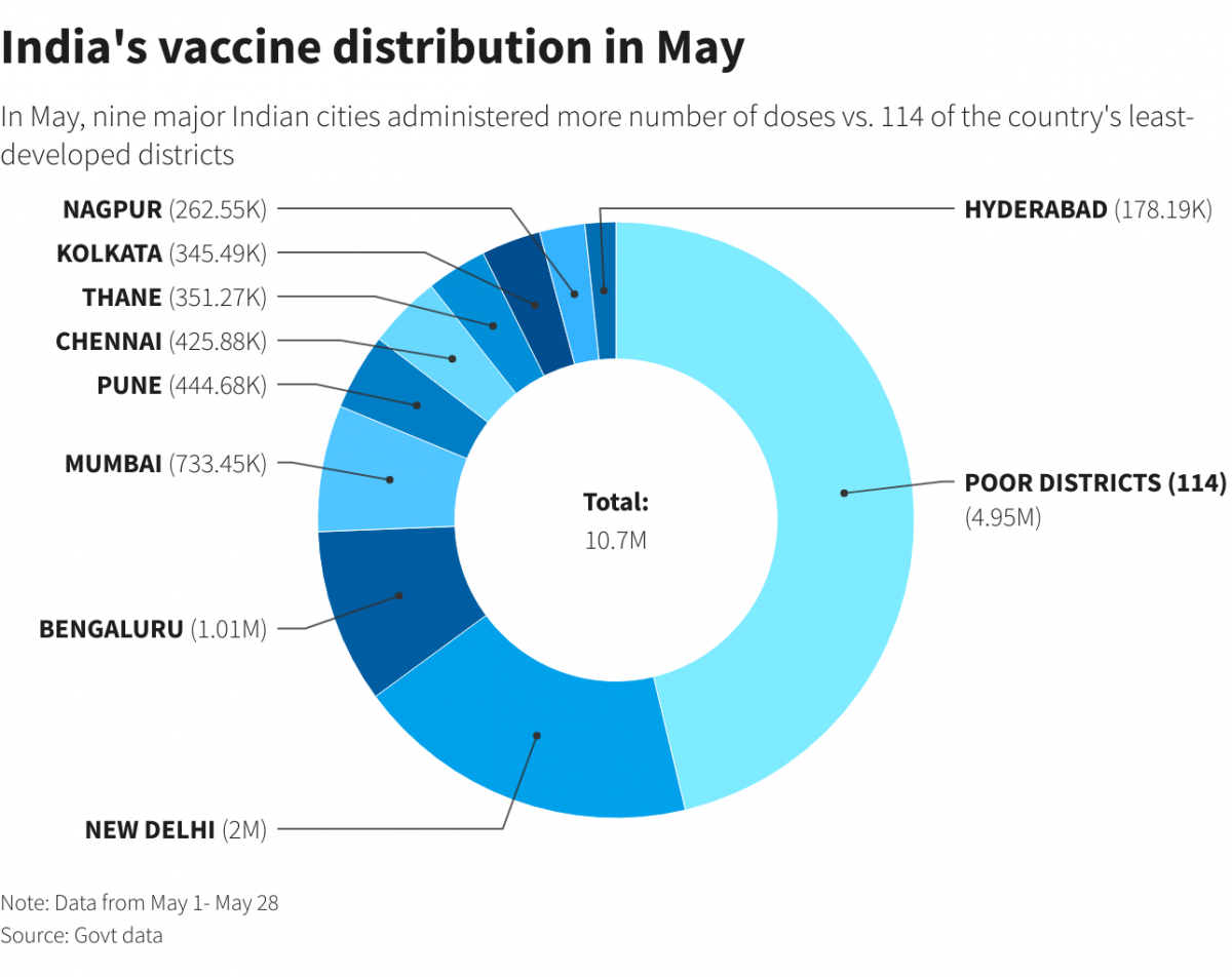 The disparity was even stronger last month, after the government allowed private sales of vaccines for adults aged under 45 years, an offer which favoured residents of cities with larger private hospital networks. For the first four weeks of May, those nine cities gave 16% more doses than the combined rural districts, data from the government's Co-WIN vaccination portal shows.