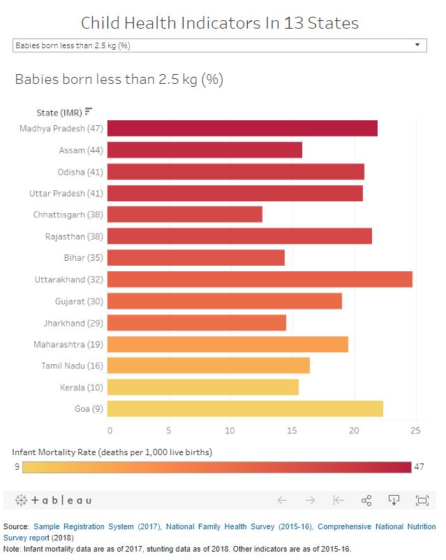 Both states with high and low infant mortality have similar birth weight of babies, our analysis found. Uttarakhand (24.7%) had the highest percentage of low birth weight babies in 2015-16, followed by states with high infant mortalities such as Madhya Pradesh (21.9%), Rajasthan (21.4%) Odisha (20.8%) and Uttar Pradesh (20.7%) similar to Goa (22.3%)--which has low infant mortality--and Maharashtra (19.5%).