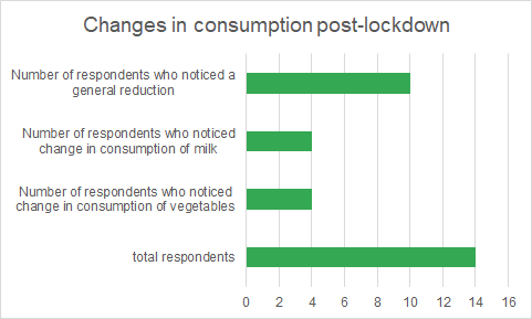 While studying the change in consumption patterns during the pandemic for most domestic workers, the most noticeable change (as seen in Figure 2 below) was observed in the consumption of milk, milk-related products, and vegetables. There was an observed reduction of up to 50% in the consumption of milk in most households.