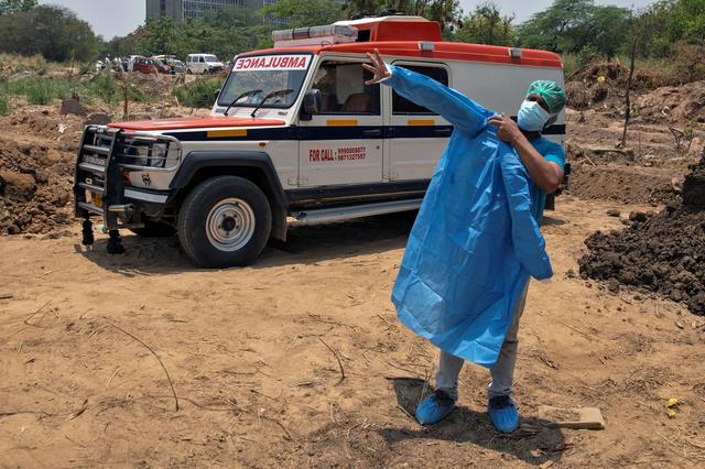 An ambulance driver changes his personal protective equipment (PPE) as he prepares to take out bodies of people who died due to the coronavirus disease Photo: Reuters/Danish Siddiqui
