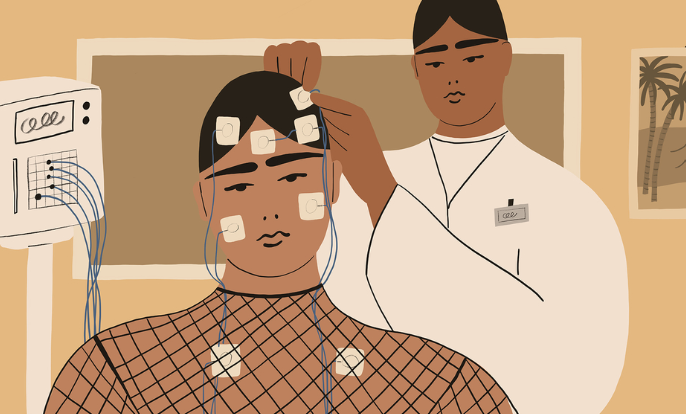 A technician showed me into a small bedroom containing a double bed and an armoire. Behind the bed, a horizontal window looked into a lab-like room stuffed with equipment. I changed into some flannel sleep pants and called the technician back in. She stuck electrodes over my chest and head, then gave me a fishnet shirt to put on to hold the wires in place.