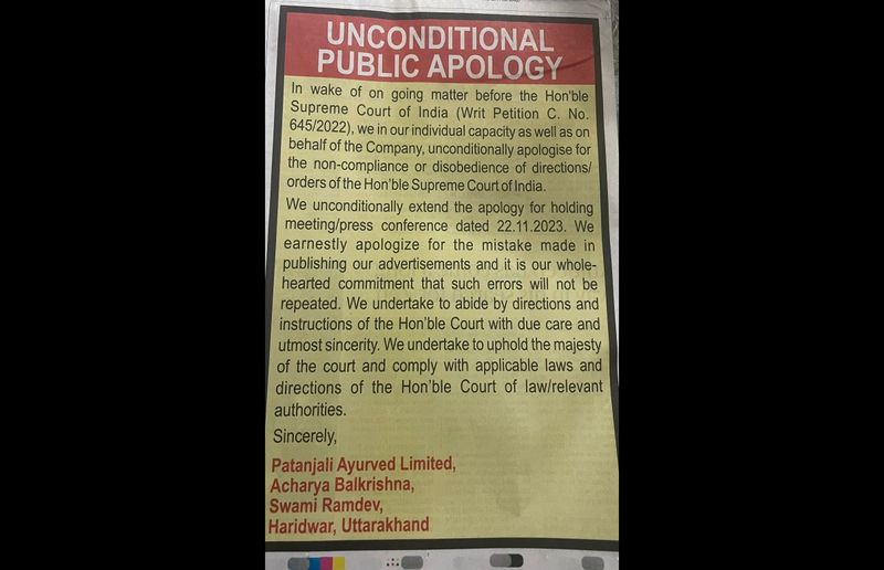 New Delhi: A day after being questioned by the Supreme Court on whether their printed apology in newspapers was as big as their misleading ads, Patanjali Ayurved co-founder Ramdev and managing director Acharya Balkrishna had issued a fresh apology in the newspapers on Wednesday (April 24) morning.