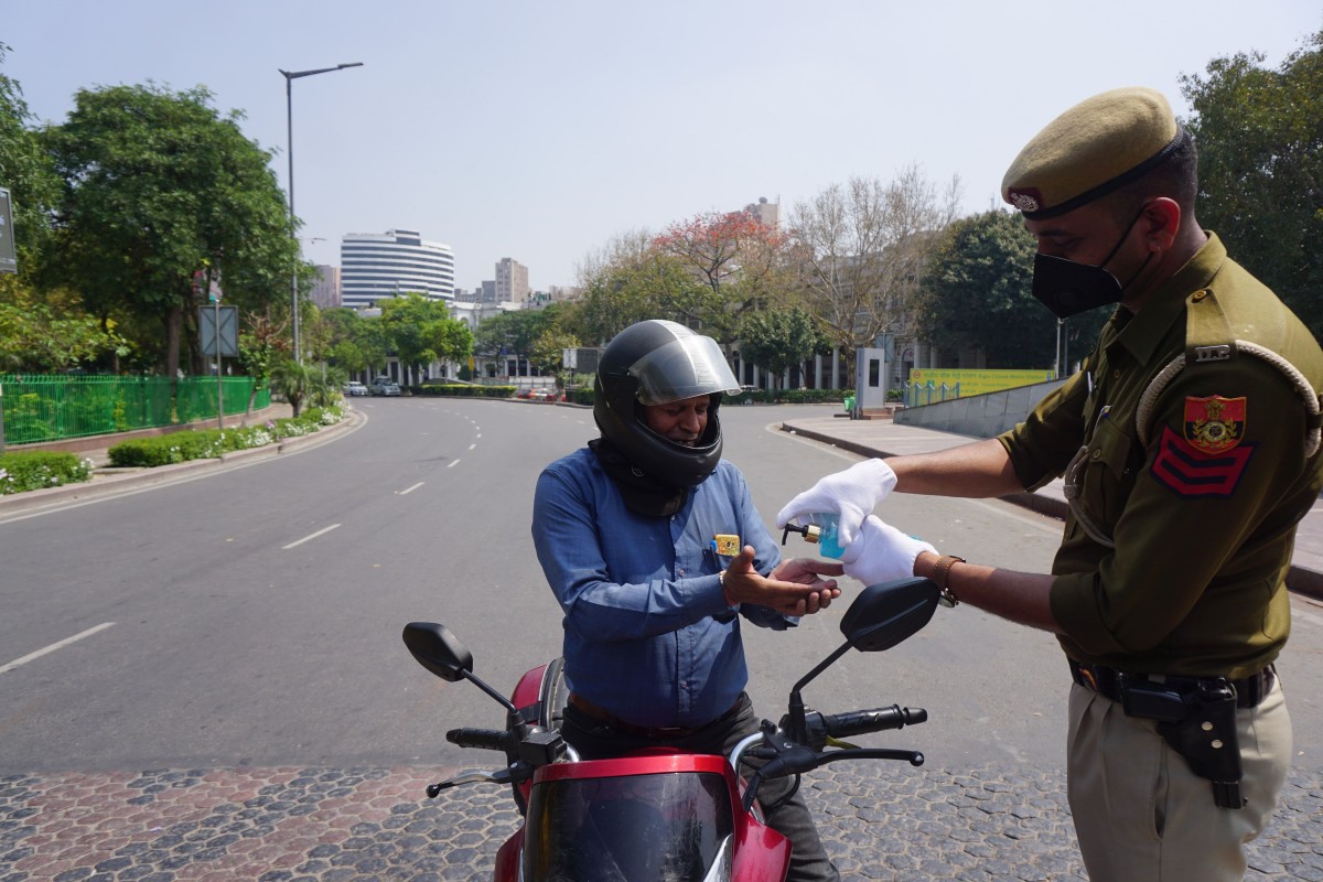 Delhi Police lend sanitisers to commuters on the roads on Janata Curfew Day. Photo: Shome Basu