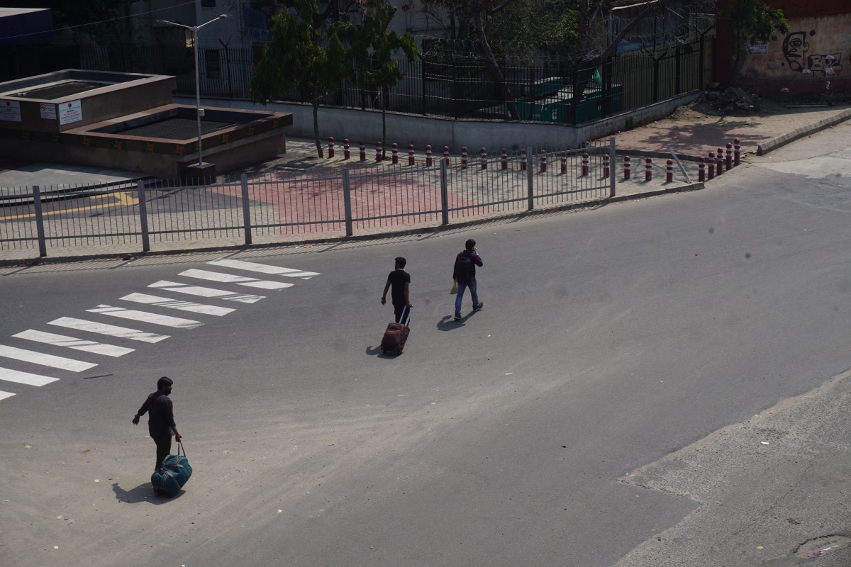 Passengers who came by train to Nizamuddin station walk home with their luggage. Photo: Shome Basu