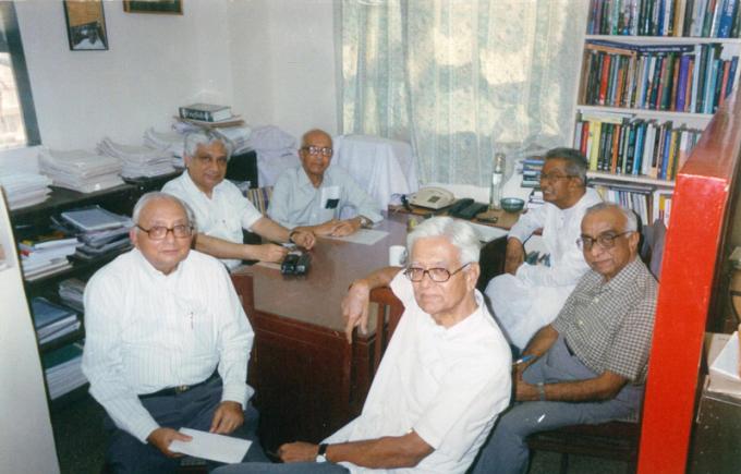 Krishna Raj, editor of the Economic and Political Weekly from 1969 to 2004, seen here with the trustees of the Sameeksha Trust. Credit: EPW