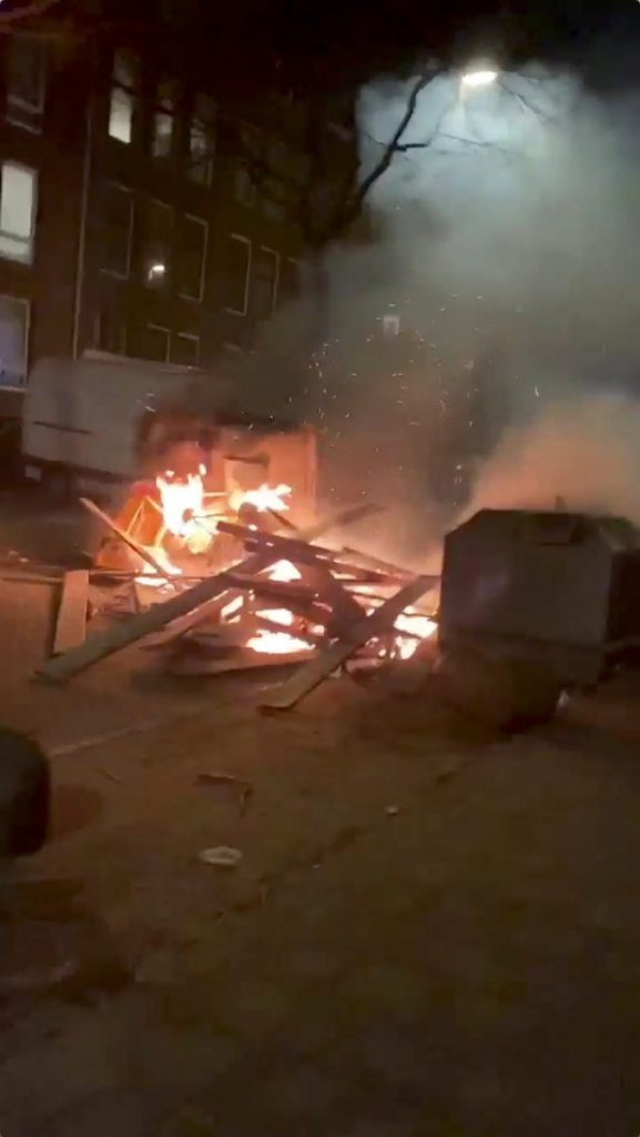 Burning objects are seen amid COVID-19 curfew protests in Rotterdam. Photo: @IMADBENOFFICIAL via REUTERS