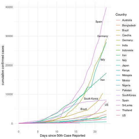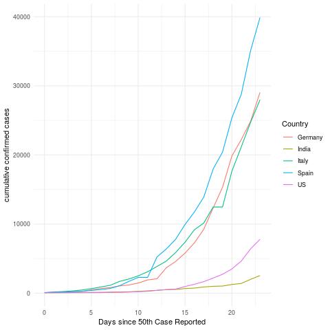 To carry out a meaningful comparison of the pandemic’s trajectory across countries, we need to note that it started at different dates in different countries. Hence, any comparative analysis must account for this staggered nature of the outbreak across countries. Comparing case counts, for instance, on a given date across all countries – for instance, March 31 – is likely to be misleading because it does not take into account that the epidemic has had different amount of time to spread in different countries. A better way to compare trends across countries is to start the comparison on the day each country in the comparison group reached a pre-specified case count. A commonly used figure is a case count of 50, and I use this for a simple comparative analysis.