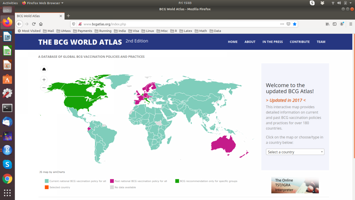 The BCG World Atlas provides information on coverage, status and policies about BCG vaccination across the world – a screenshot of the atlas is provided in Figure 3. The atlas divides countries with information on BCG vaccination into 3 groups. The first group of countries has current BCG vaccination policies for all, i.e. universal vaccination programs are in place – these are colour coded with light green. This groups includes most countries in the world, including India. For the countries included in Figure 1, the following belong to this group: Bangladesh, Brazil, Czechia, India, Indonesia, Iran, Japan, Kenya, Malaysia, Mexico, Pakistan, South Korea, Sri Lanka, Thailand.