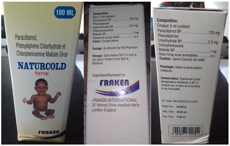According to the WHO for the region of Africa, the stated active ingredients of Naturcold syrup are listed as paracetamol, phenylephrine hydrochloride and chlorpheniramine maleate — a combination used to relieve symptoms associated with the common cold, flu and allergic rhinitis.