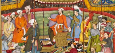Not wishing to engage in war, King Kayd of Hind offered Iskandar four gifts as tribute: his daughter in marriage, his all-knowing philosopher, his personal physician and his never-emptying goblet. This scene shows his envoy's reception at Iskandar's camp. Iskandar accepted Kayd's gifts and so bloodshed was avoided. Photo: Artist, Dharamdas. Lahore, 1593-5, Public domain